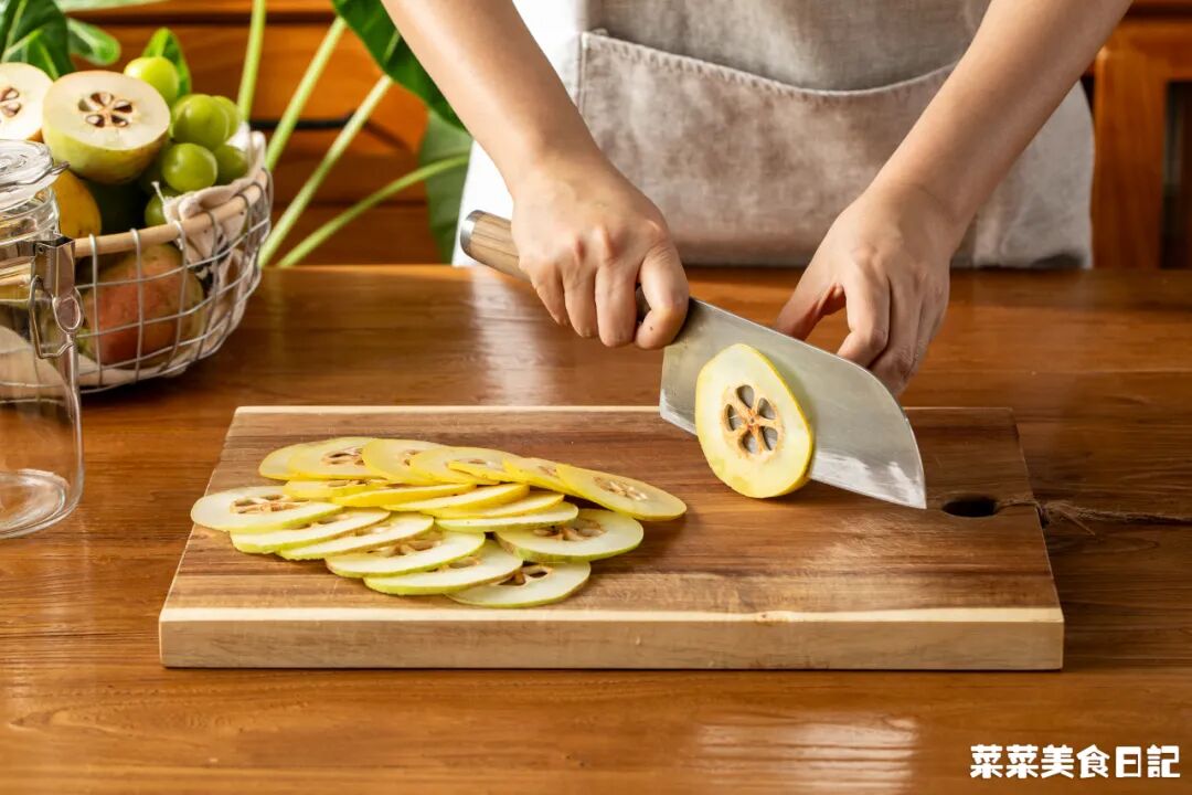 2.酸木瓜对半切开,用镊子或筷子挑出籽,再对半扣在案板切薄片