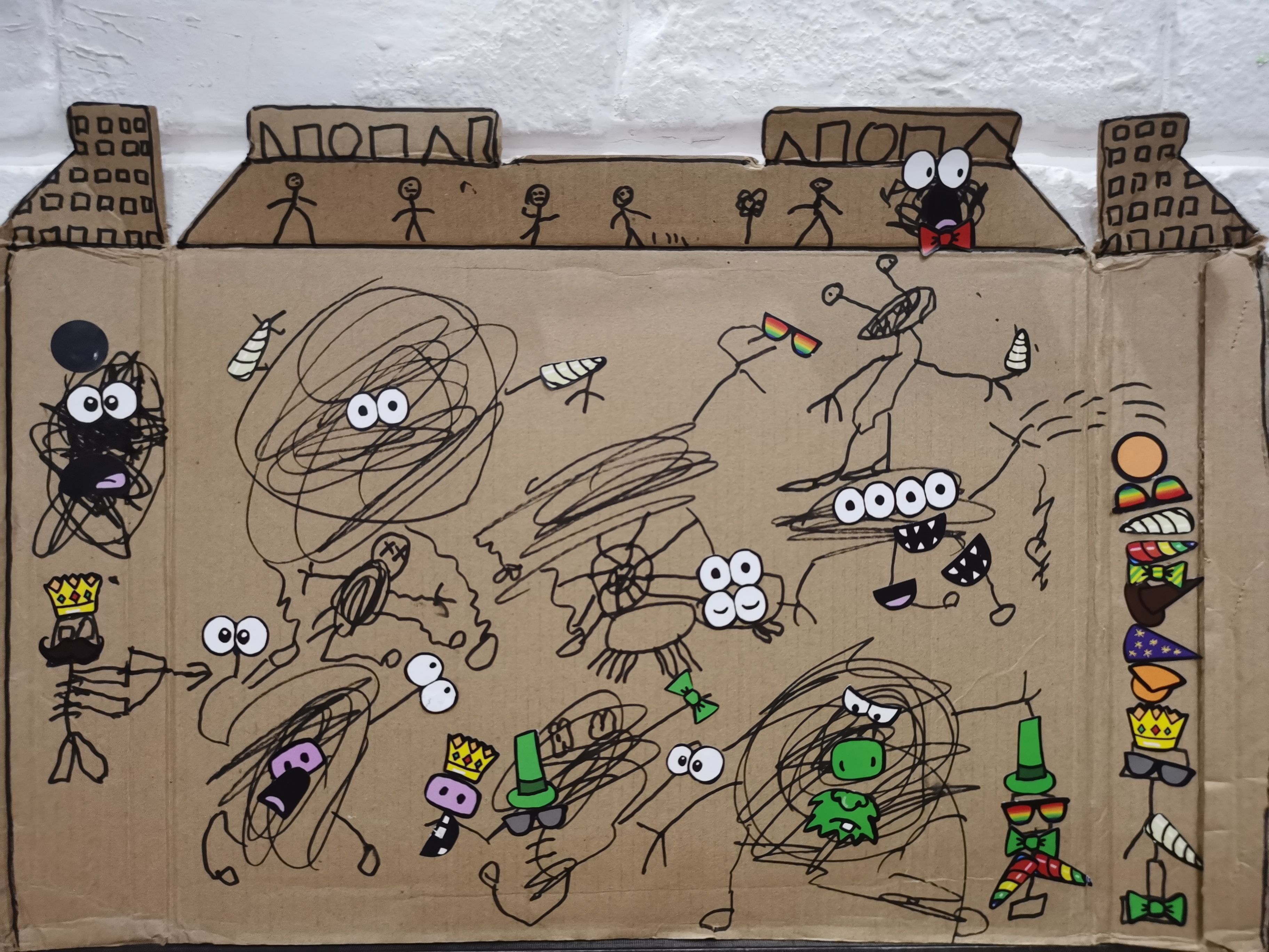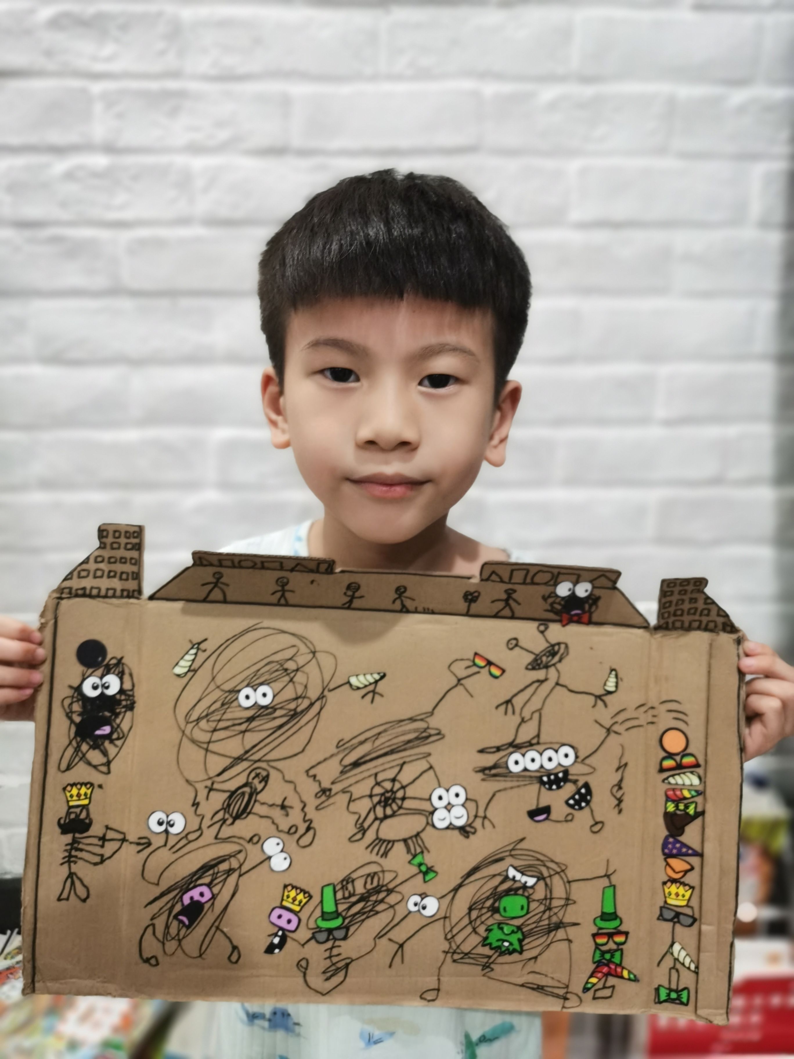 哥哥立马用起快递盒子即兴涂鸦,艺术就该这样无拘无束,随时随地都能创作,创作的“涂鸦怪兽城堡”有故事有情节,