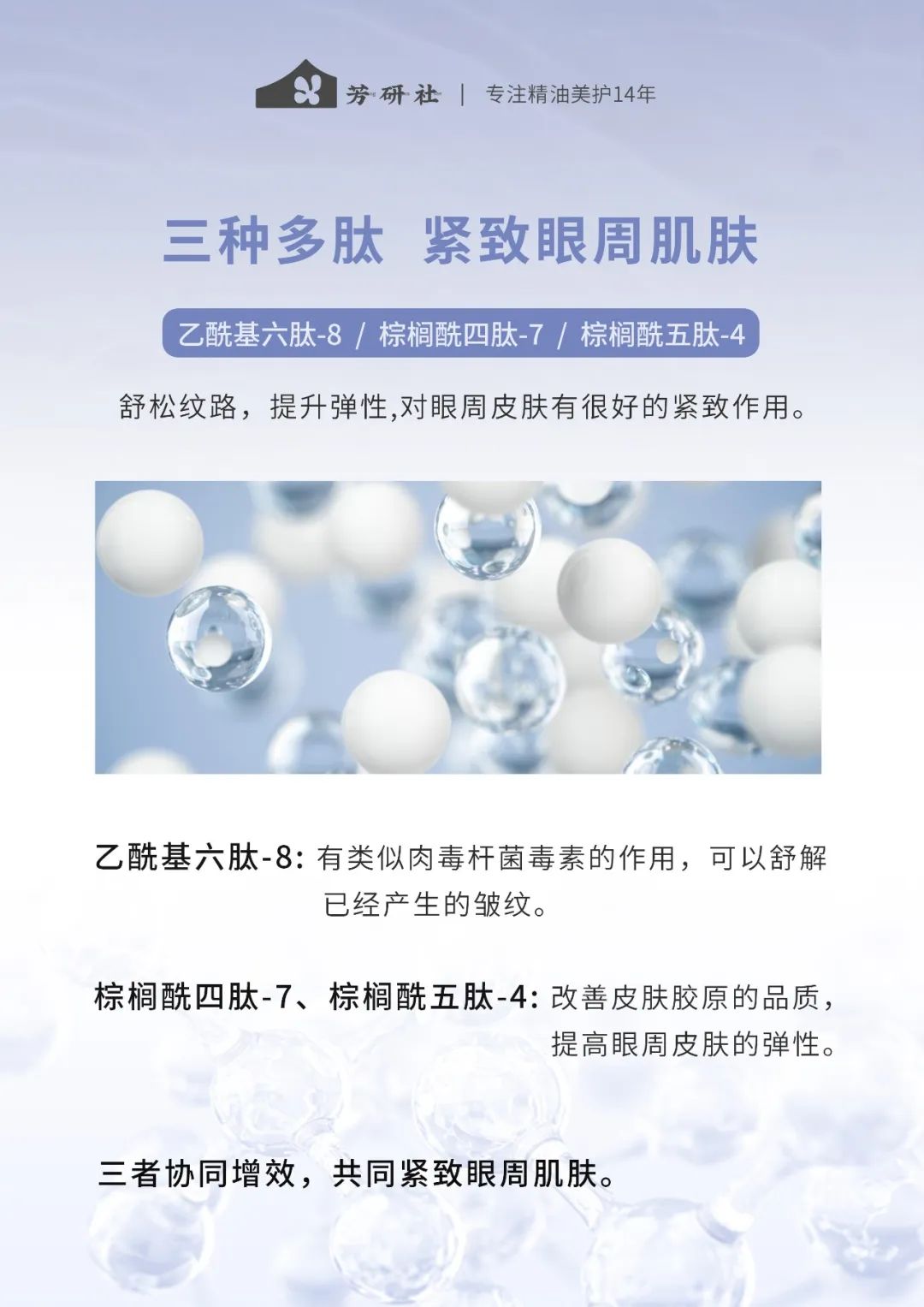 棕榈酰四肽-7和棕榈酰五肽-4,进入皮肤后会刺激胶原蛋白的合成,皮肤的弹性也会跟着增加,这样就会有一个从里到外全面的紧致效果。三者可以协同增效来紧致眼部肌肤以及淡化皱纹。