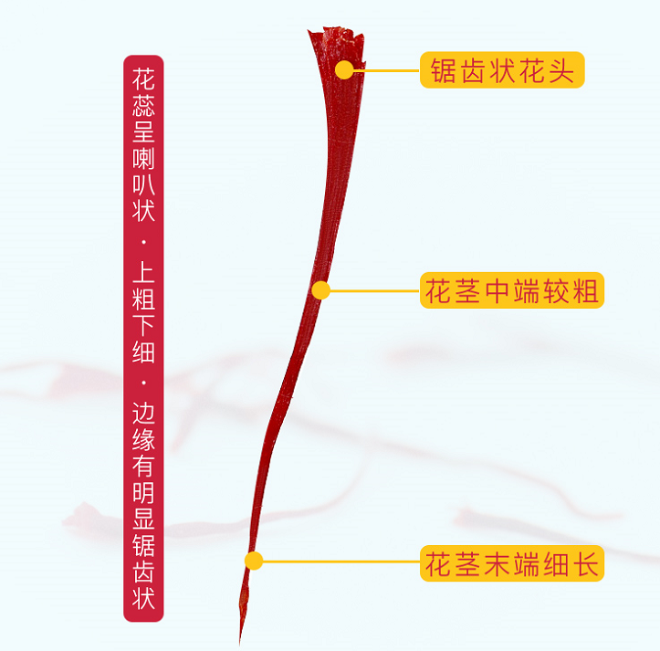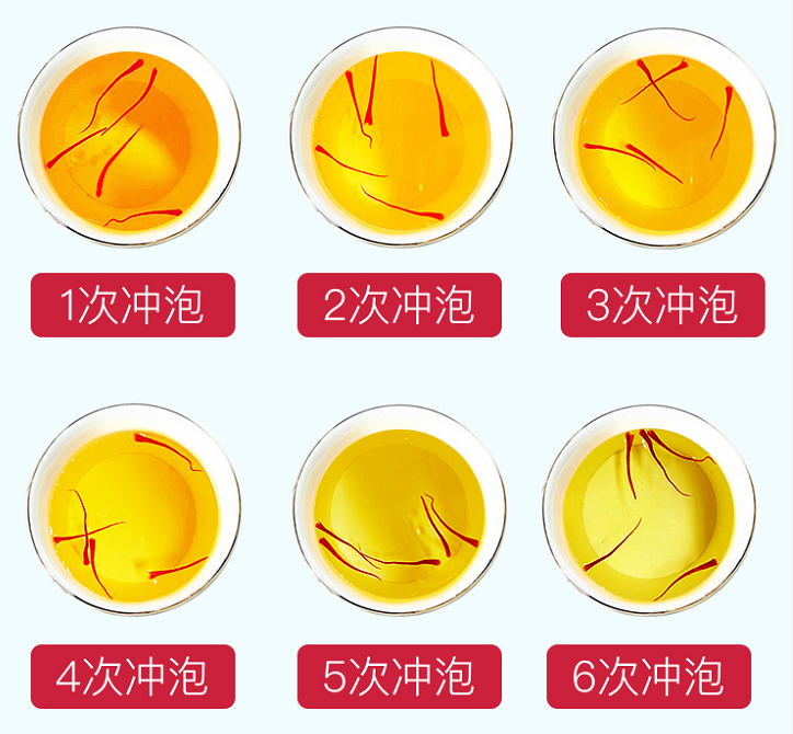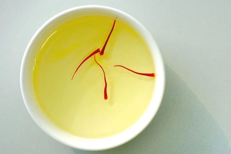 藏红花放入水中,柱头会扩大膨胀呈现喇叭状,释放金黄色拉丝,茶汤金黄明艳,无沉淀物,气味清香特别,浸泡后的花丝在短时间内用针拨之不会粉碎。