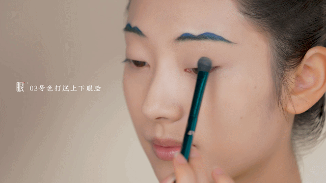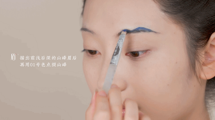 描出前浅后深的山峰眉后,再用蓝色眼影点缀山峰。