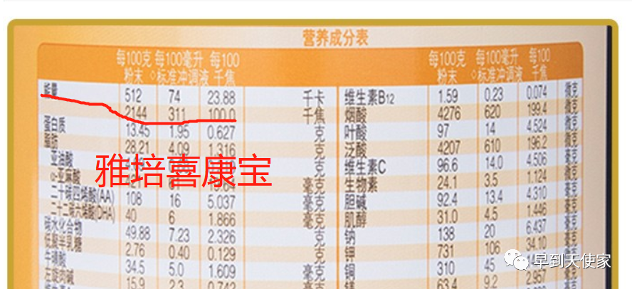 通过营养成分表我们可以看到每100ml奶粉