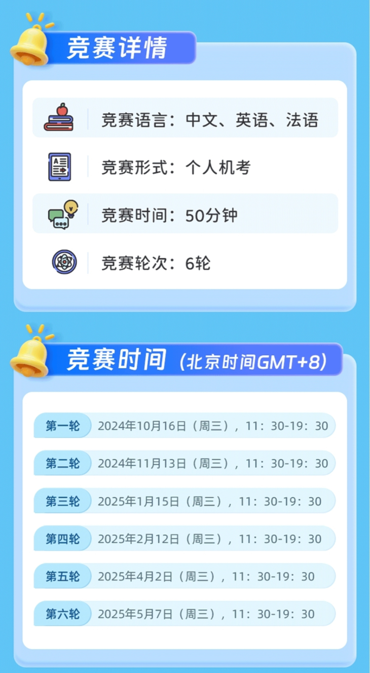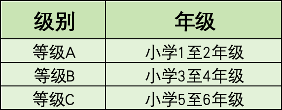 注:等级 1 在线考试提供中文读题功能,确保小选手都能听懂题目,学生可以选择报名高于所在年级的级别考试,不允许选择低于所在年级的级别。
