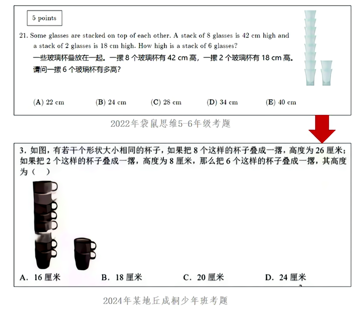 如果是小学段,袋鼠数学比赛的真题可以说是目前创新性题目做的最好的了。近年来,甚至国内很多选拔拔尖苗子的考试都在使用这里的题目进行改编。可以说,袋鼠数学真题是小学段的创新题库。