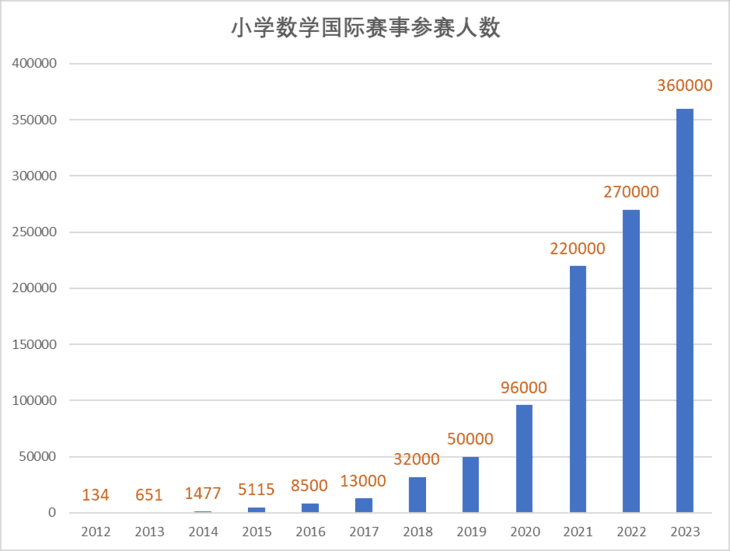 这几年参赛的人数爆发式增长,截止到去年,整一年参赛的小学生人数就超过了36W。