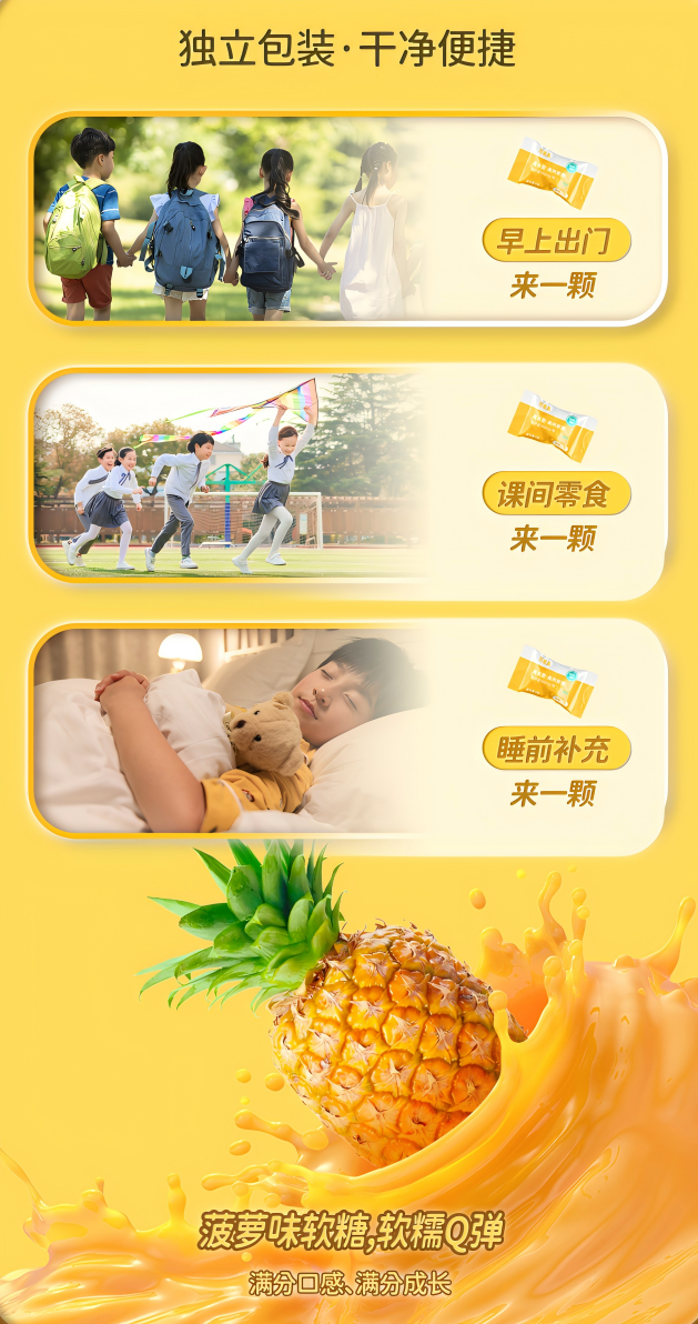 而这款软糖一粒就同时添加维生素 D、维生素 A,轻松满足身体生长营养需求,一举三得!✌