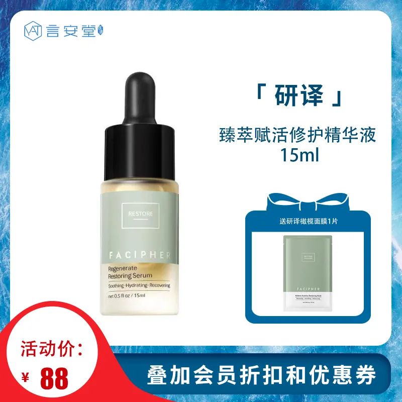 活动价88元15ml 送1片面膜(研译橄榄面膜),可再叠加20元社群专属优惠券,下拉至文末二维码进群领取