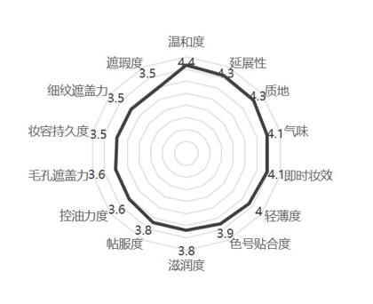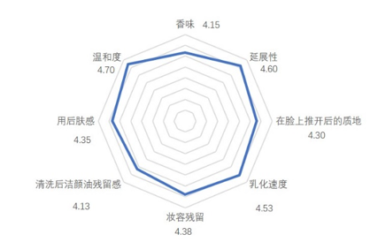 使用过后,受试者对试用产品总体满意,满意度达77.85%,非常满意的人数占总比16.77%,在各项分数中,代表肤感的几个项目:轻薄度、温和度和延展性得分最高,均在4分以上。