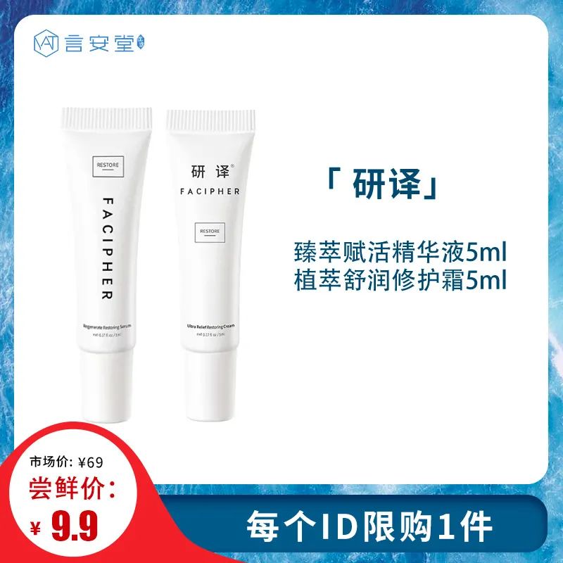 尝鲜价:研译臻萃赋活精华液5ml+研译植萃舒润修护霜5ml,活动价12.9元,关注服务号减3元,到手9.9元(限每人一份哈)
