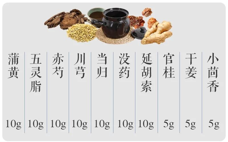 组成:炒小茴香,干姜,延胡索,当归,川芎,没药,官桂,赤芍,蒲黄,炒五灵脂等。