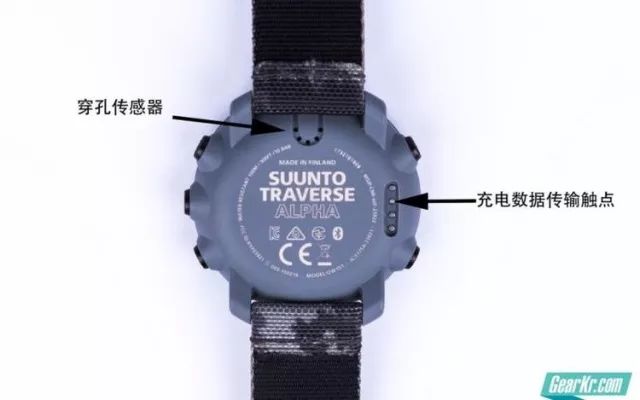 在腕表的背面,可以看到设置有穿孔式传感器,充电以及数据传输电缆端口,防水,蓝牙连接,型号,承压范围等技术参数标识。