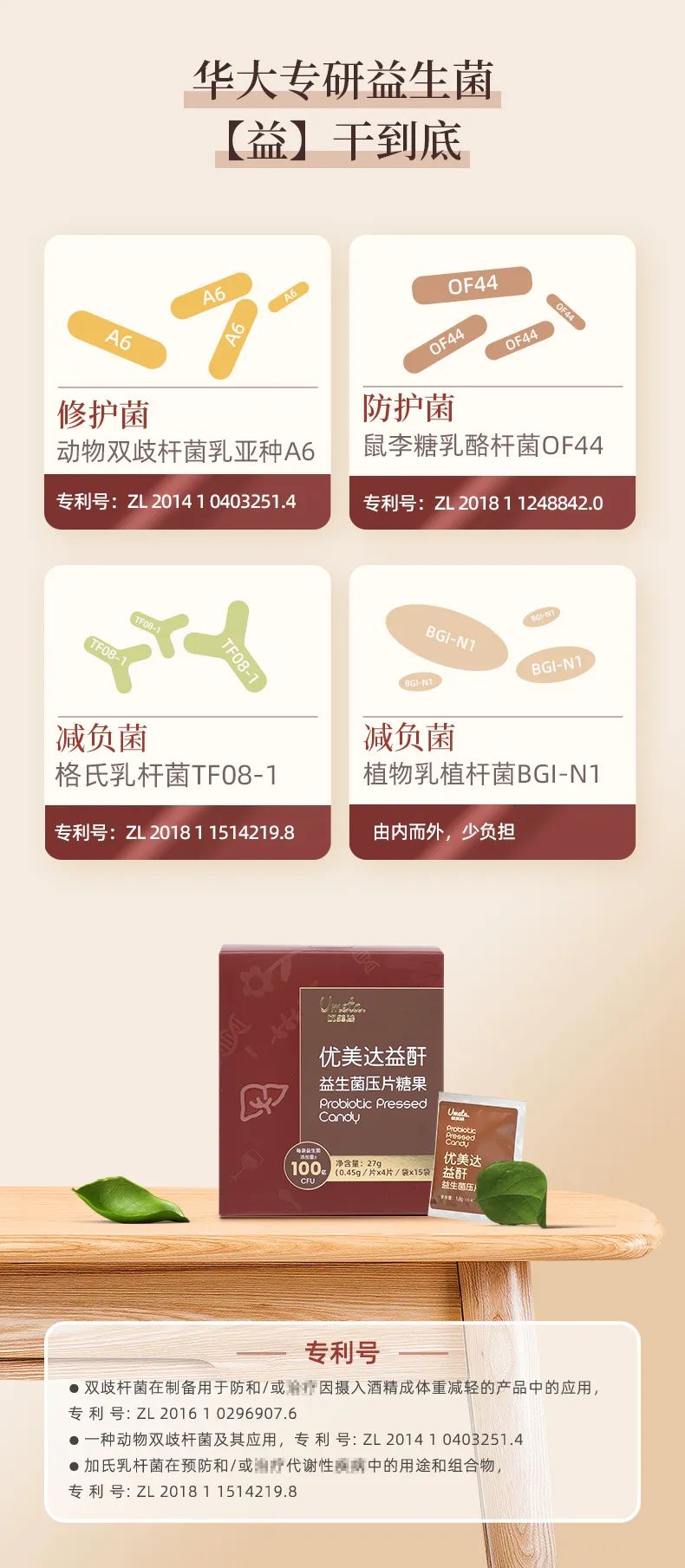 ·鼠李糖乳杆菌OF44(专利号ZL 2018 1 1248842.0):抑制肠道有害菌,增加有益菌,促进菌群平衡,增强防护力。