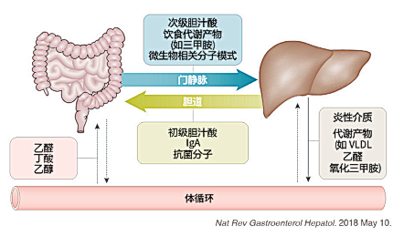 肝脏和肠道,一个是最大的消化腺,一个是最大的消化道。肝脏会将分泌的胆汁酸和抗菌分子,经过胆道输送到肠道,控制肠道细菌过度生长,维持菌群平衡;肠道就会将部分微生物及其相关的代谢产物,通过门静脉传递给肝脏,干预肝脏的工作。