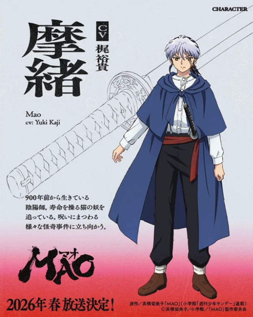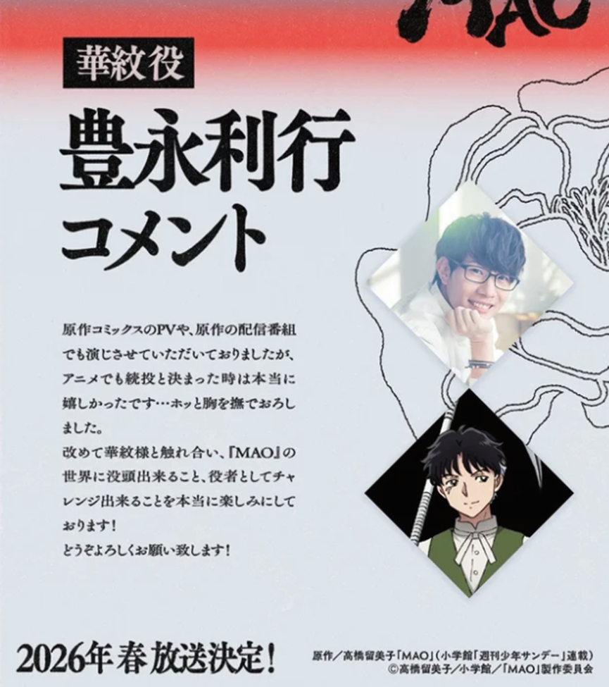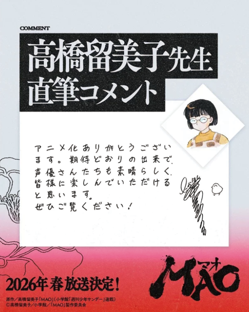 梶裕贵留言: “终于……终于可以宣布了!从最初接受采访到现在已经过去五年半,从第一次为角色配音到现在也有四年,从正式开始最终录音到现在也有一年半。终于迎来了能与大家分享《MAO》动画化的喜讯的时刻!我真的从心底感到无比幸福。能参与我所深爱的高桥留美子老师的作品,我满怀感激之情,在每一集都倾注了全力。佐藤照雄监督带领的制作团队充满了爱与热情,最终成果我可以自豪地说非常精彩!请大家一定期待播出!”