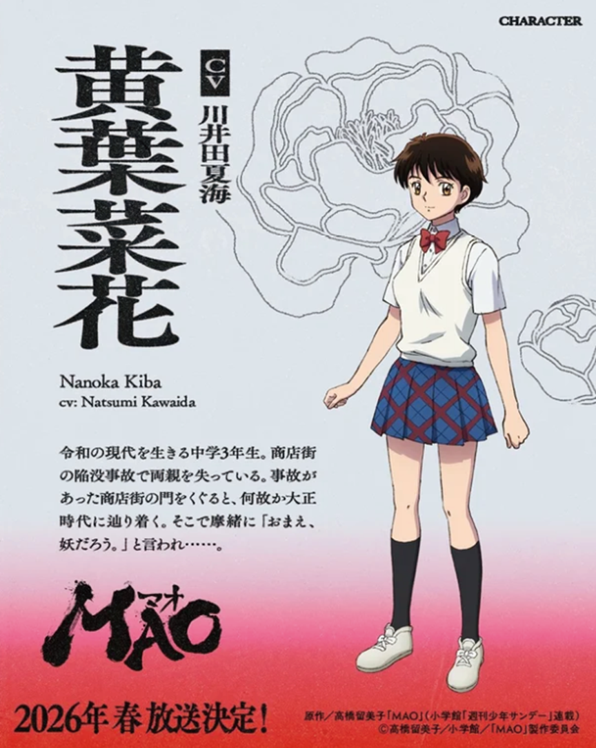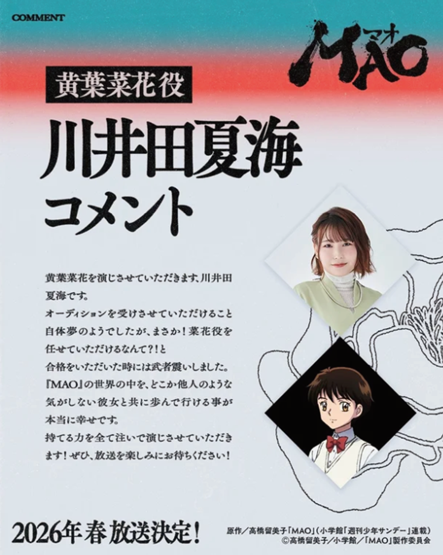 川井田夏海留言: “能参加试音就像做梦一样,没想到竟然真的让我来演绎奈奈香!当我通过试音时激动得发抖。能与她一同走进《MAO》的世界,我感到非常幸福。我倾注了全部心力来演绎这个角色!请大家期待播出!”