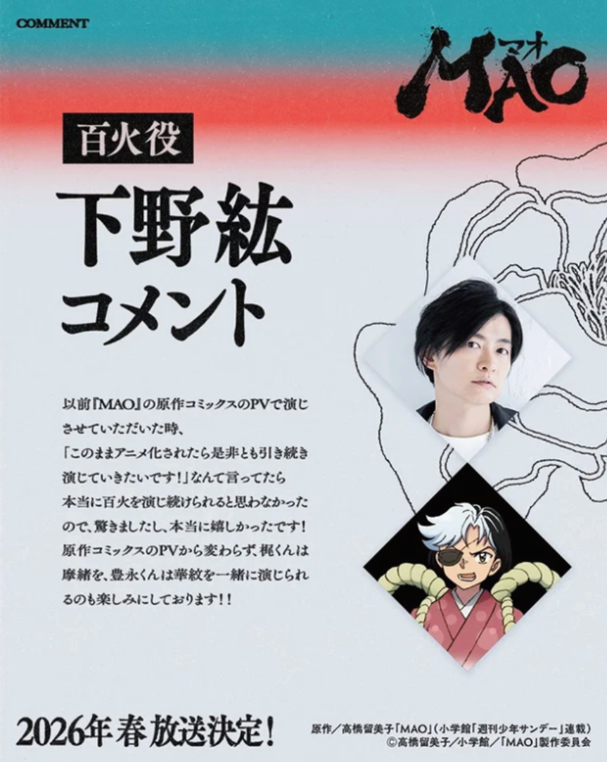 下野纮留言: “之前在《MAO》漫画PV里我就说过:‘如果以后真的动画化,我一定要继续演百火!’没想到真的实现了,既惊喜又开心!能再次与梶裕贵(MAO)和丰永利行(加门)一起合作,我非常期待!”