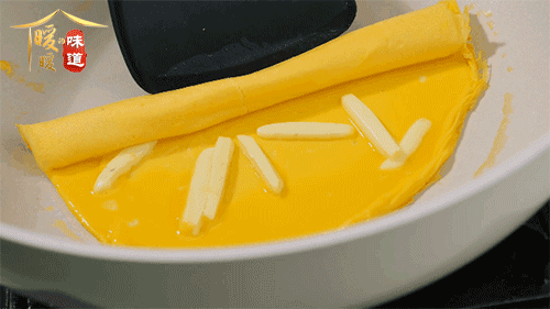 卷起来再倒入蛋液,再放入奶酪,依次卷起来。