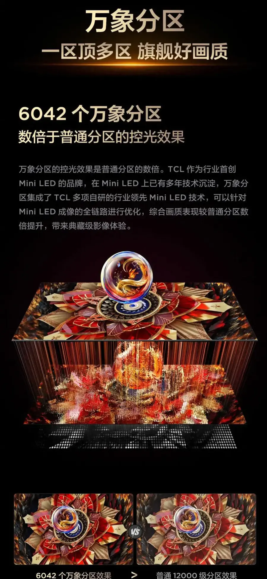 在明暗场景中可以展现更丰富的细节。TCL的Mini LED电视控光分区数是300+分区起步,高端/旗舰型号能达电视能达两三千级以上;峰值亮度在1200nit以上,高端/旗舰型号甚至能到5000nit以