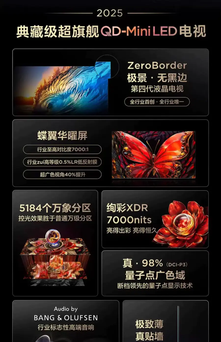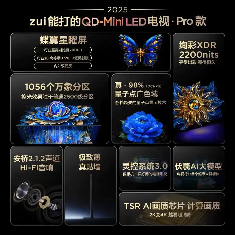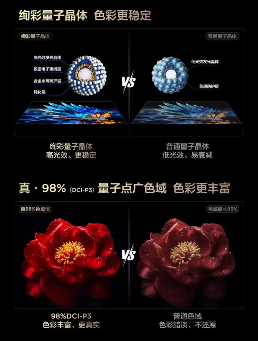 有量子点的 Mini LED 电视色彩更出色、画质更优秀,才能被称之为 QD-MiniLED 电视;采用升级版的绚彩量子晶体,以稳定的合金结构保证电视色彩 10万小时不褪色,同时带来 98%的超高色域