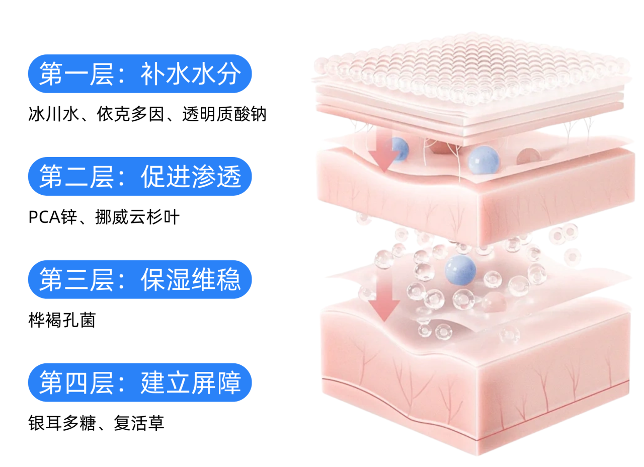 遵循科学护理肌肤,在四个维度分别搭配各类大牌成分,让有效的护肤成分,搭载专研科技渗透肌肤层,逐层释放,有效活力因子,唤醒肌肤活力;