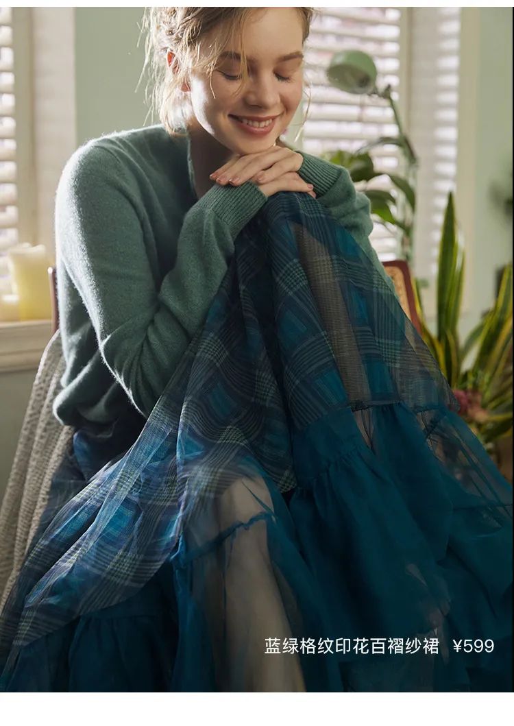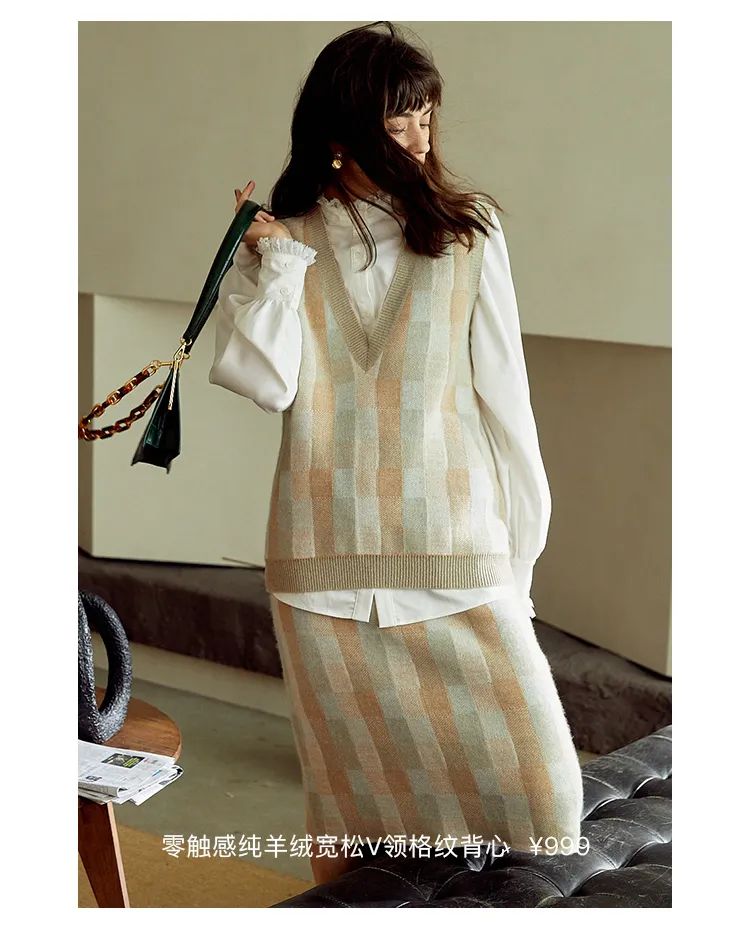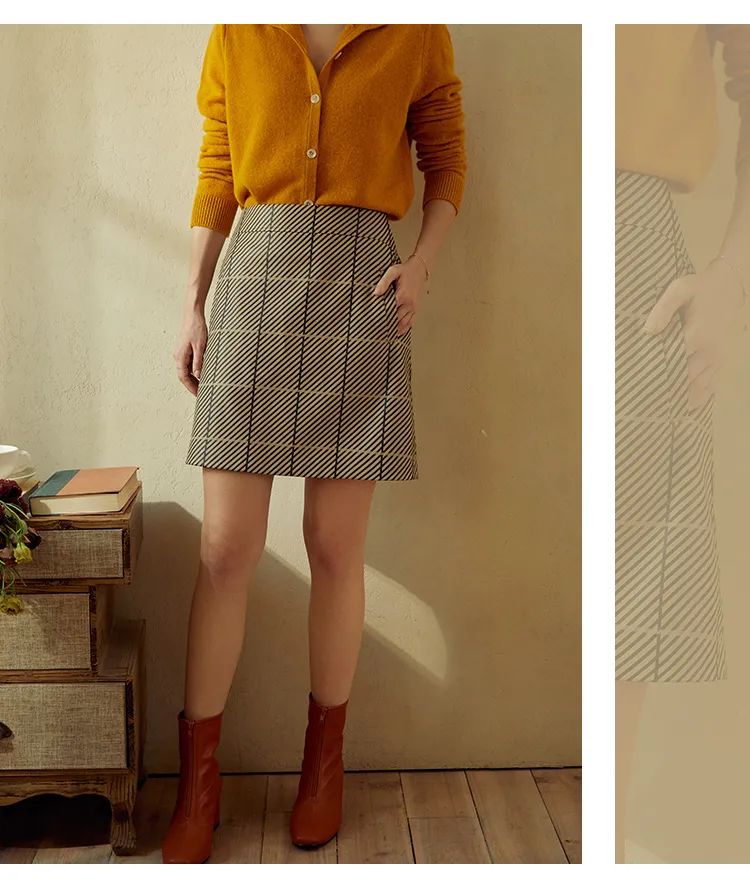 - 零触感纯羊绒宽松格纹直筒裙 -