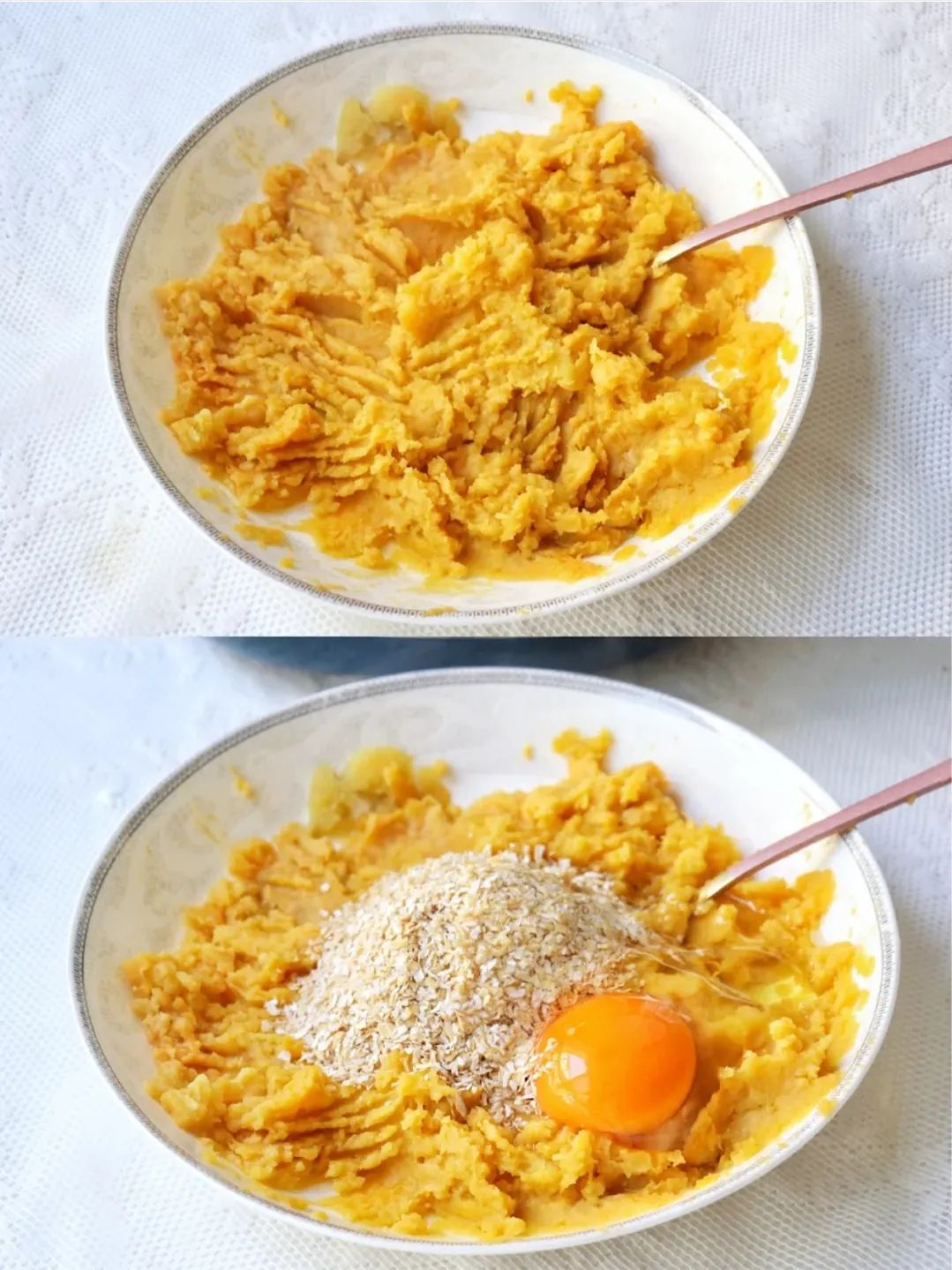 ② 红薯搅拌成泥,倒入麦麸,磕入鸡蛋,搅拌均匀;