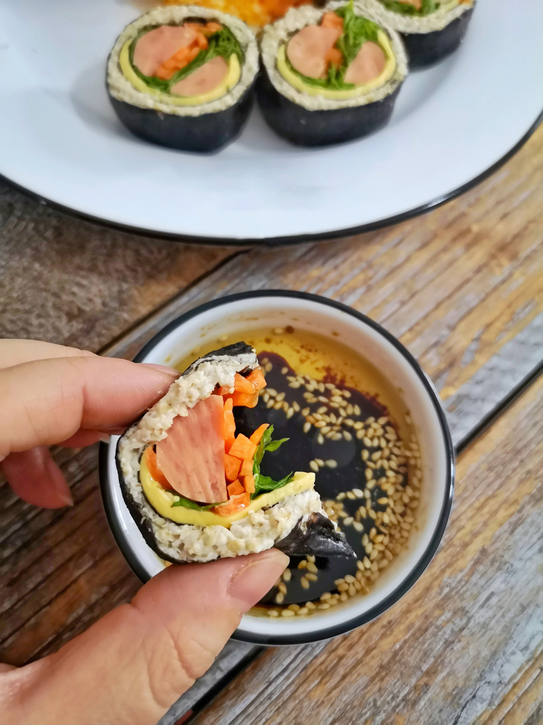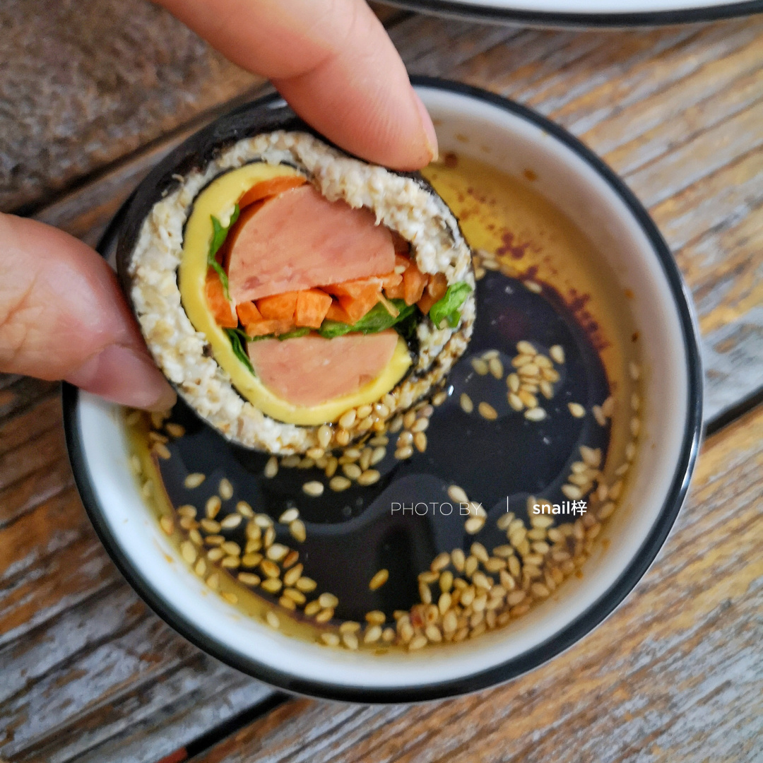 酱汁:寿司酱油/生抽、芝麻油、芥末酱、黑胡椒碎、几滴柠檬汁 | (芥末酱没有可不加) |