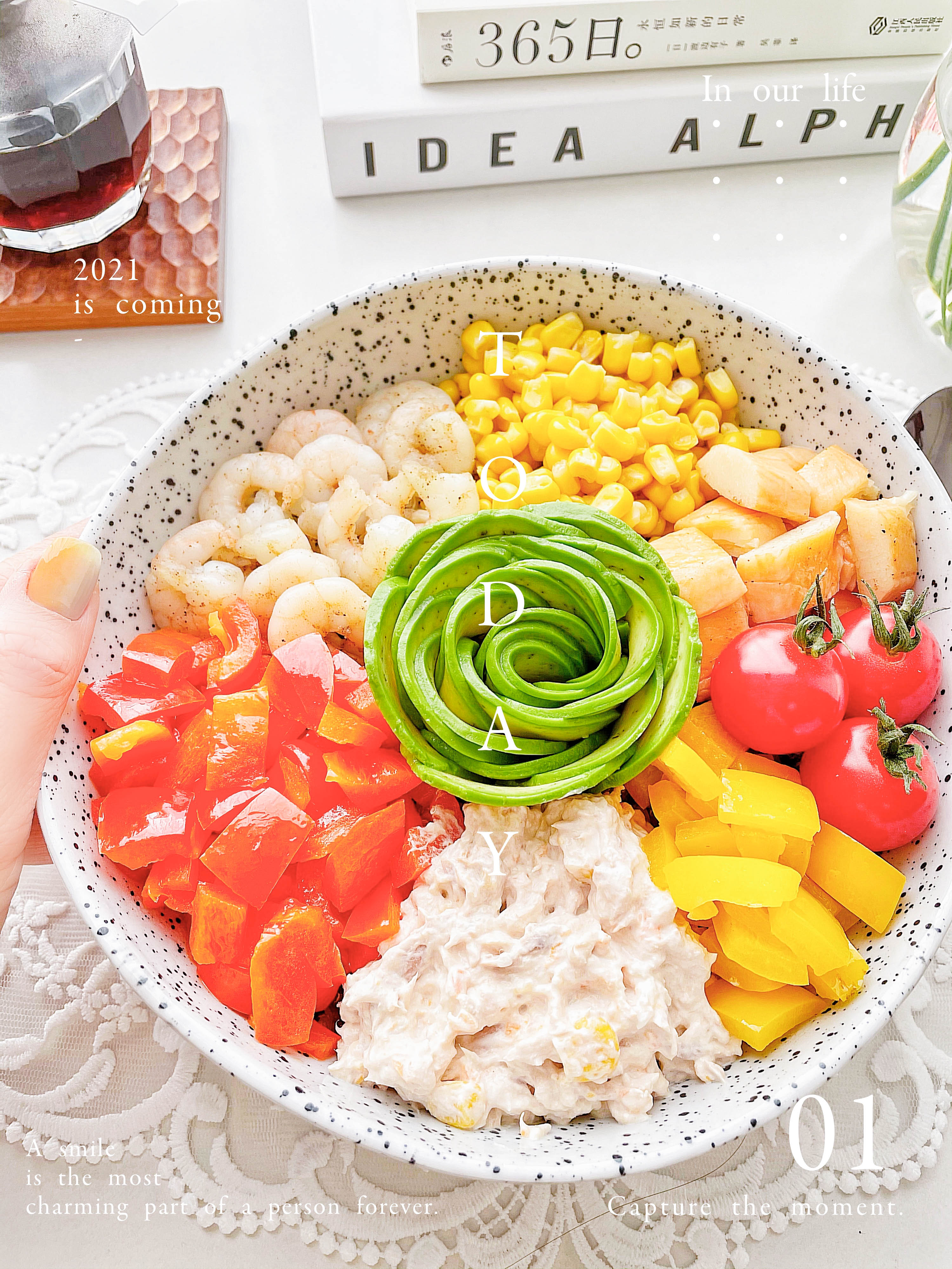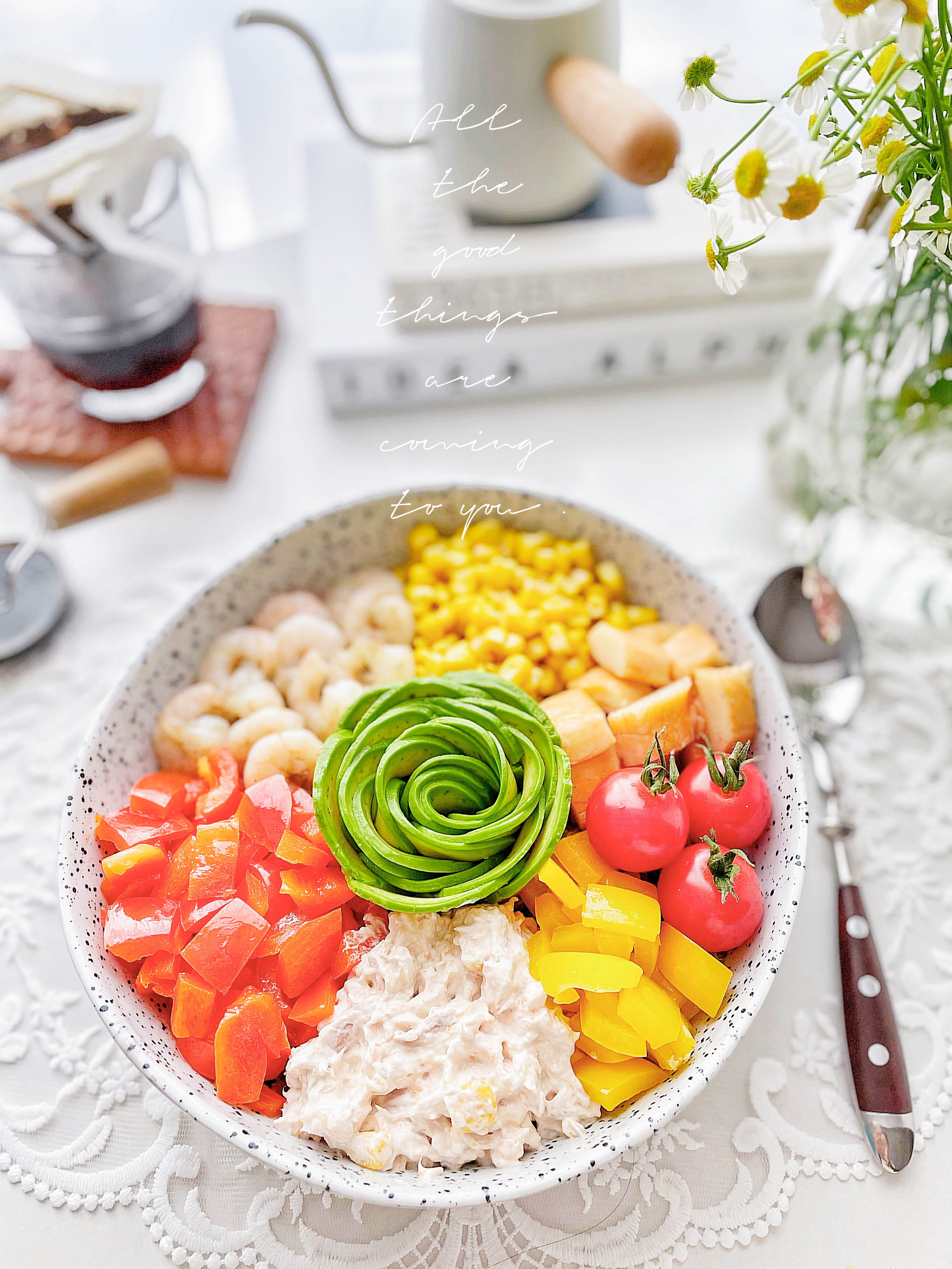 彩椒、小番茄、玉米、金枪鱼、虾仁、牛油果、蟹柳 | 个人喜欢的彩色配菜 |