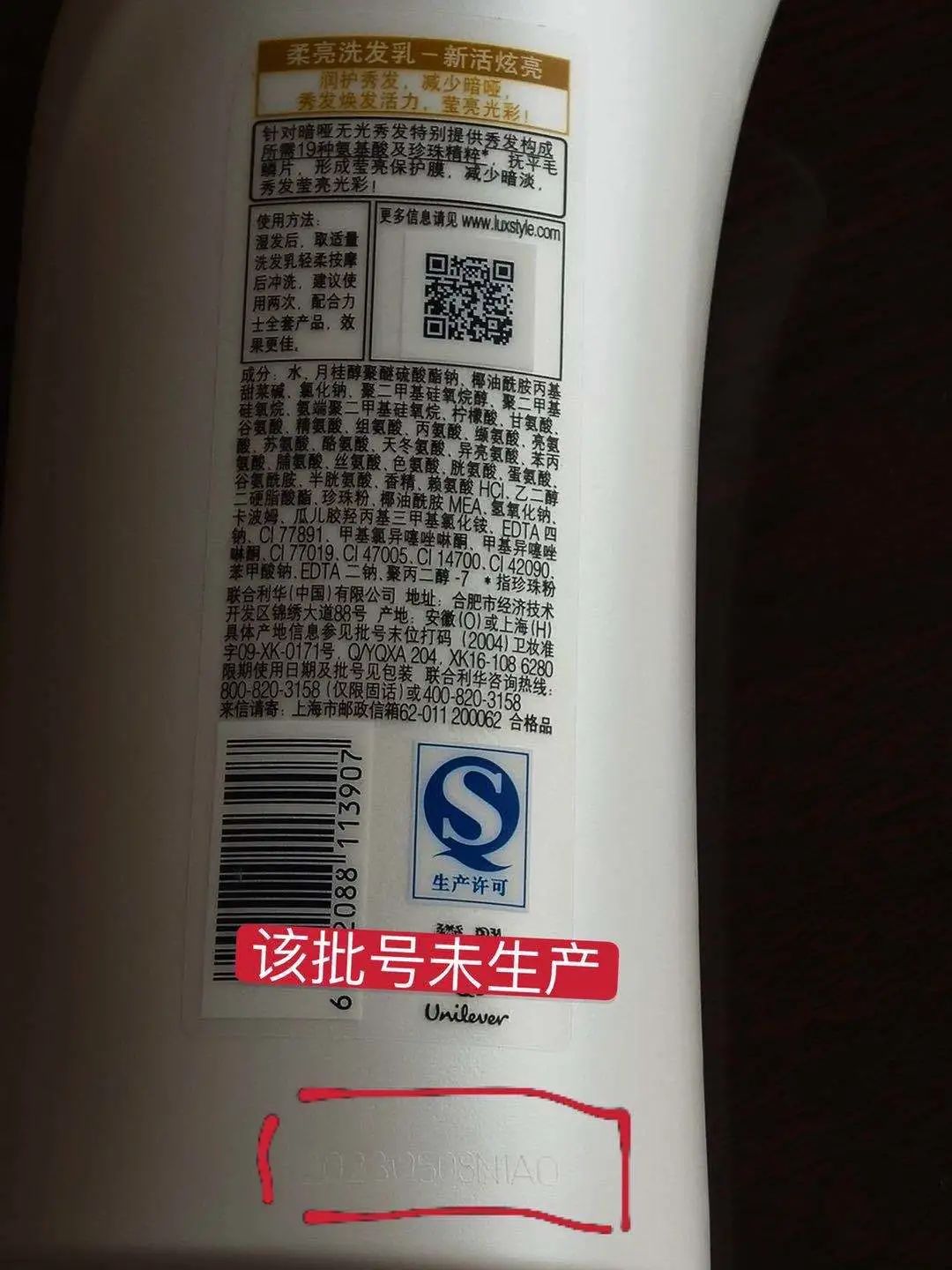 1. 瓶身上的生产批号为:20230508NIAO。联合利华(中国)有限公司声明从未生产过该批号产品,