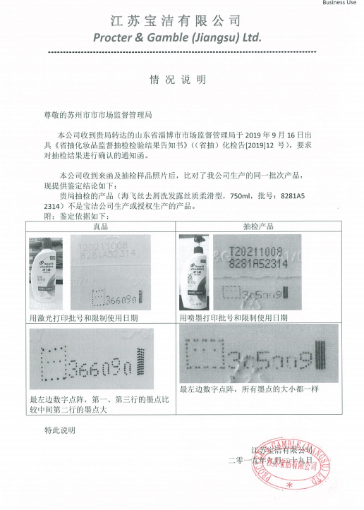 但对于抽样产品是否是伪造的,还需要进一步的证据。于是品牌方向我们提供了江苏宝洁有限公司向苏州市市场监督管理局递交的关于抽检样品为仿冒产品的证明文件。