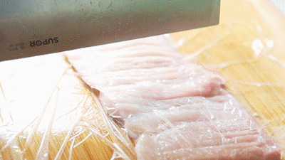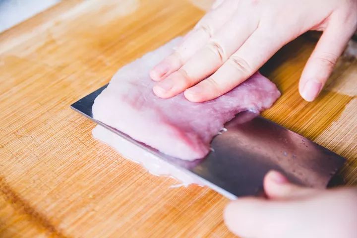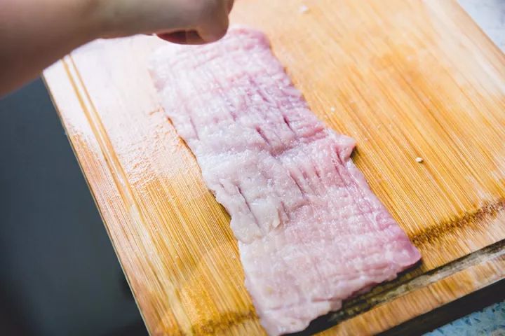 ▼ 1. 处理猪肉:猪里脊先切成方形,再横向切开,但不切断,切成约5mm厚的猪肉片。