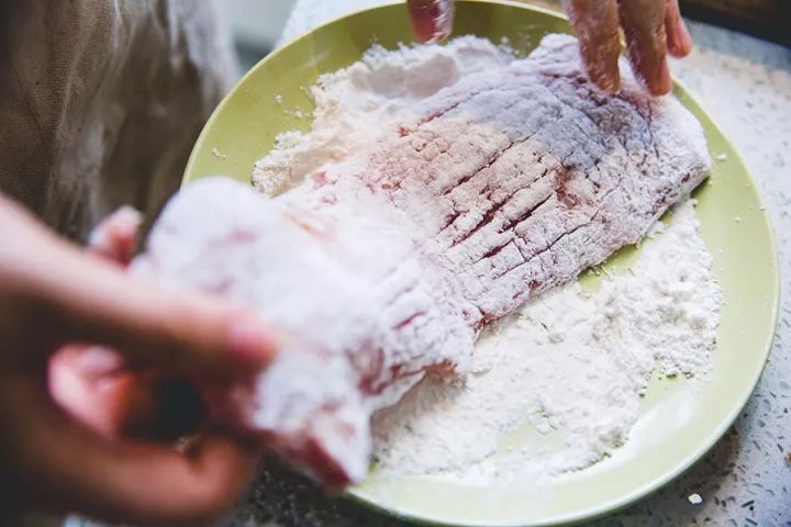 ▼ 3. 裹面粉:面粉放在大盘子里铺平,放入猪排,两面均匀裹上一层面粉。