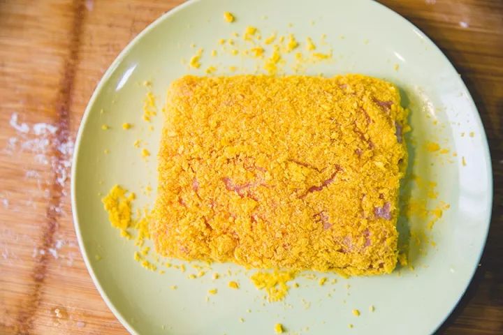 » 裹完面包糠后,让它在盘子里静置15分钟左右,这样面包糠有时间吸水,和猪排成为一个整体,芝士不容易漏。如果直接下锅炸,会很容易散。