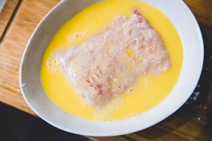 ▼ 5. 裹面包糠:将猪排合上,先在蛋液里滚一圈。