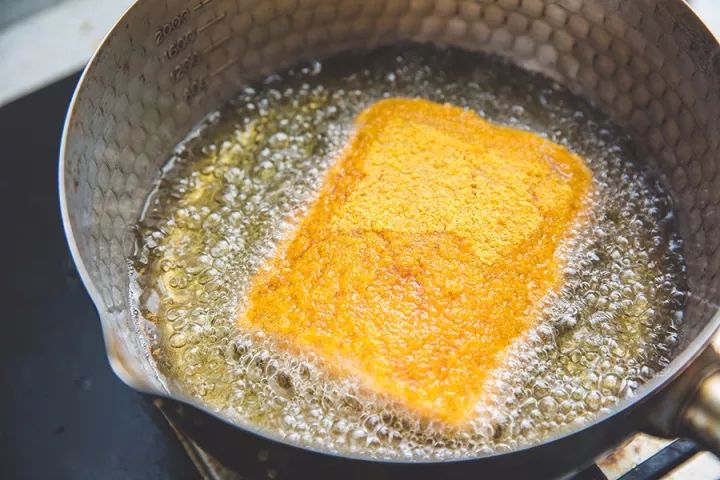 一面炸至定型之后,炸另一面。之后每隔1分钟翻面,炸10分钟,直到两面都金黄焦脆。