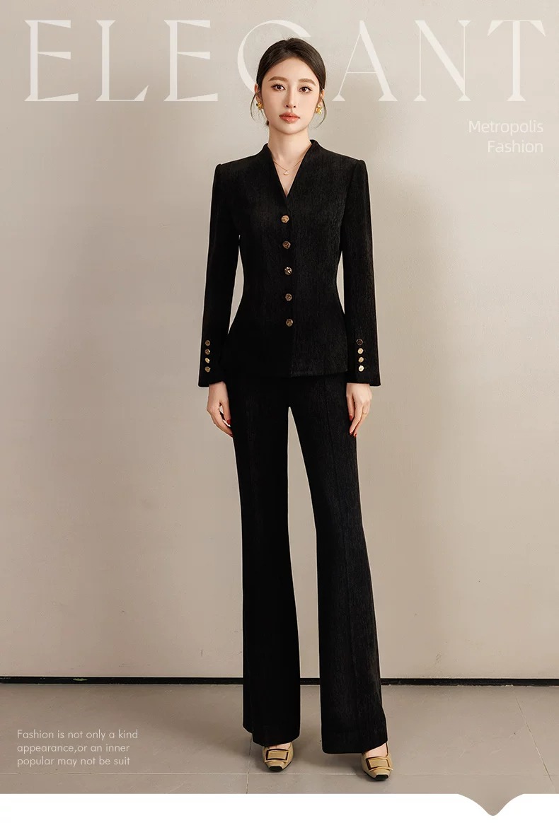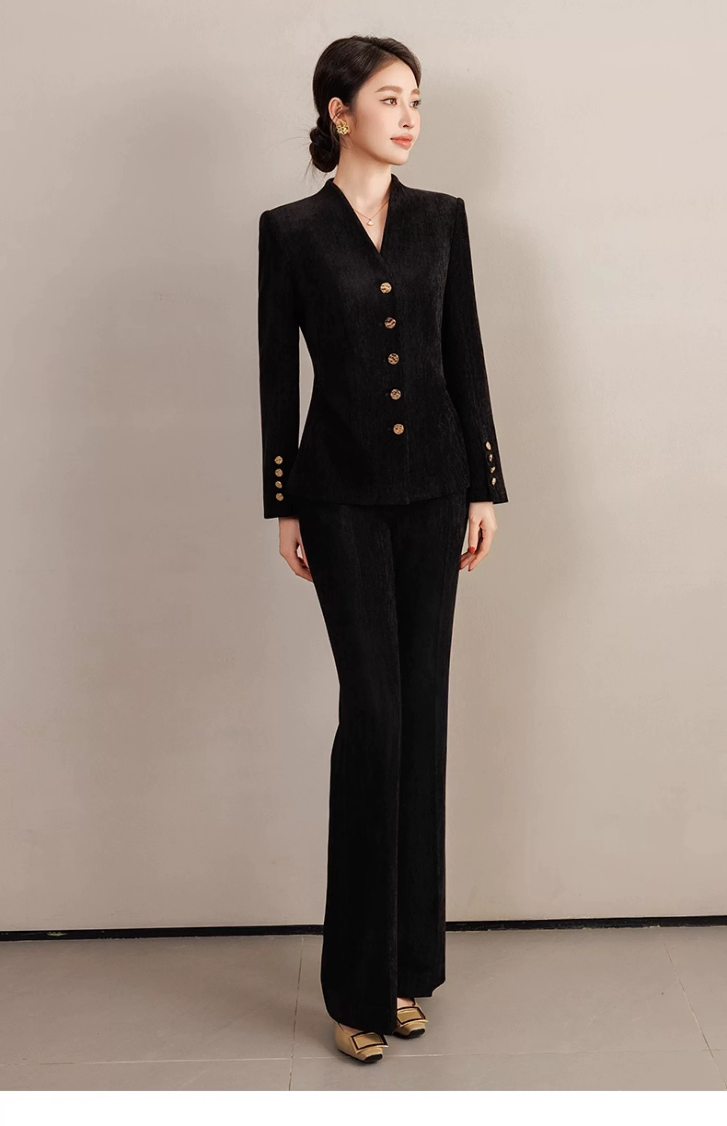V 领 + 收腰剪裁,既修饰肩颈线条,又掐出腰臀比例,自带 “头肩比优化” 效果;金属排扣点缀门襟与袖口,冷调光泽中和了丝绒的柔,干练中透着贵气。
