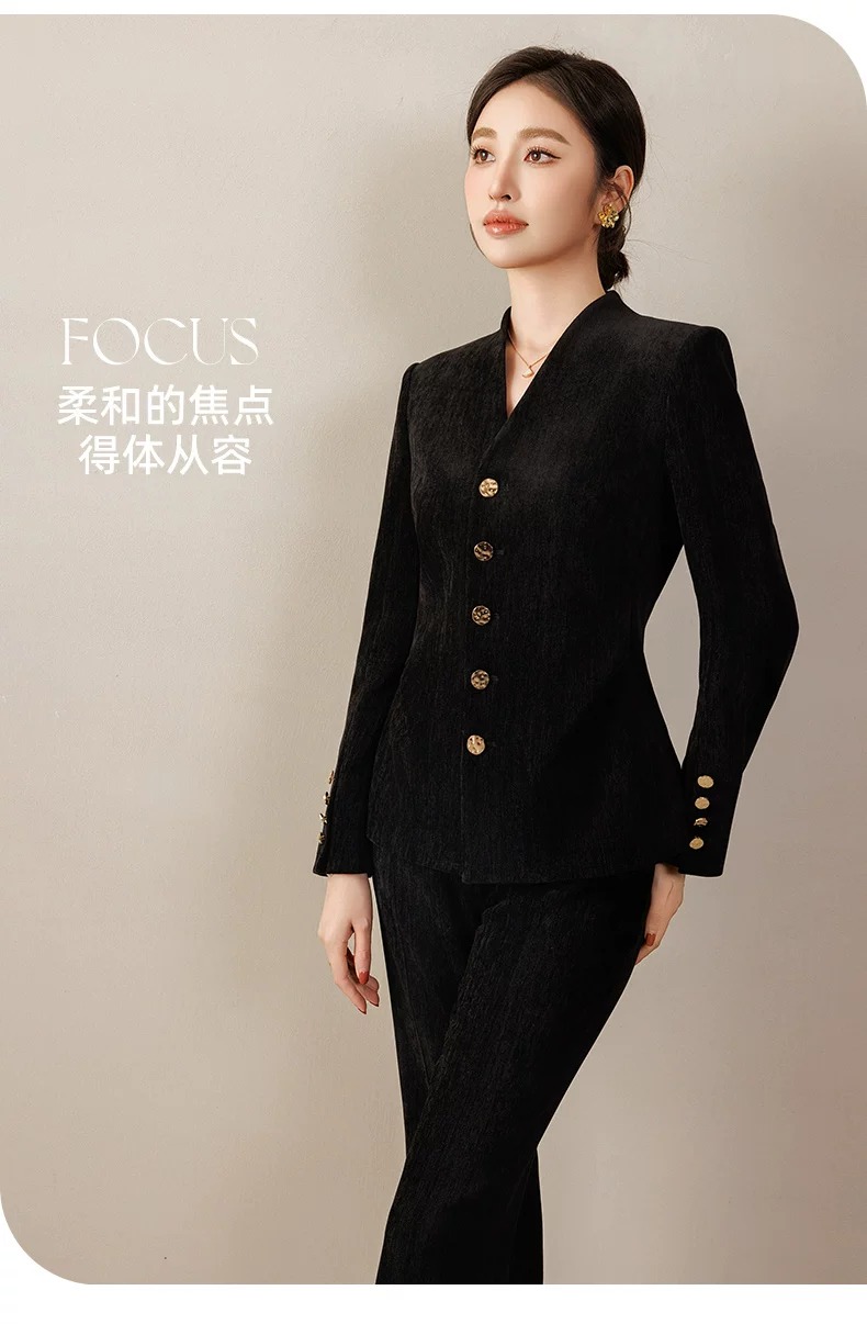 这款选用细条绒丝绒面料,哑光中带细腻光泽,不像亮面丝绒那样张扬,却在不同光线下透出高级质感;触感应季柔软,既有西装的挺括度,又有丝绒的温柔包裹感,兼顾了职场的正式与日常的舒适。
