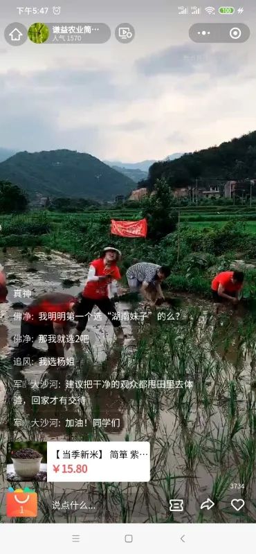 泥地里新农人们赛得热火朝天,手机那头围观农友们也不闲着,“建议把岸上的观众都甩到田里去沾点泥”、“看得脚痒痒了,好像下田里去踩踩”、“我选2号”、“我选那个湖南妹子”......