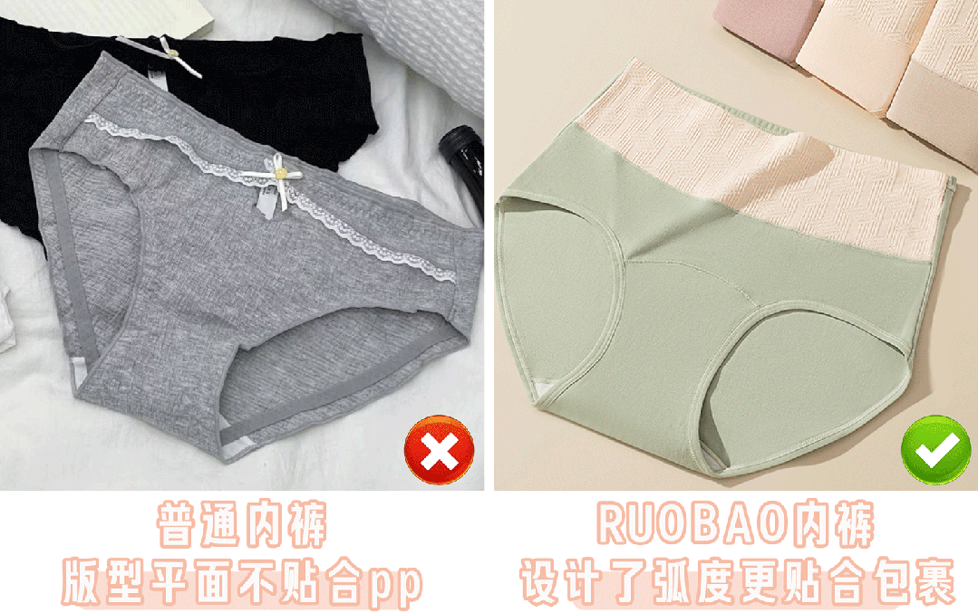 普通内裤为了压低成本偷工减料,就是几片面料缝合起来,但你想想咱们的pp是有弧度的,穿起来怎么可能会舒服?