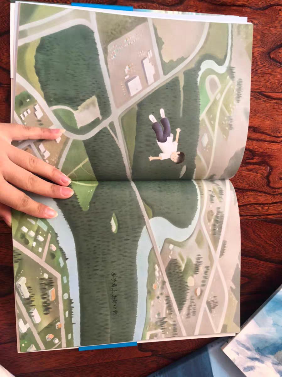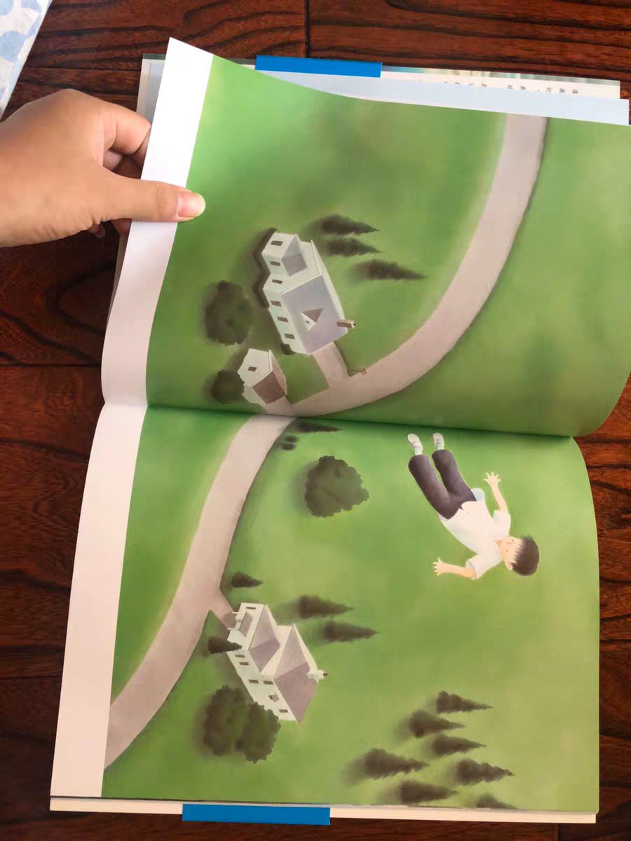 而图画一开始狭窄的形状随着主人公飞上天空逐渐张开,直到铺满整个画面,从笔触到画幅都在诉说故事,足见这位绘本大师的笔力。