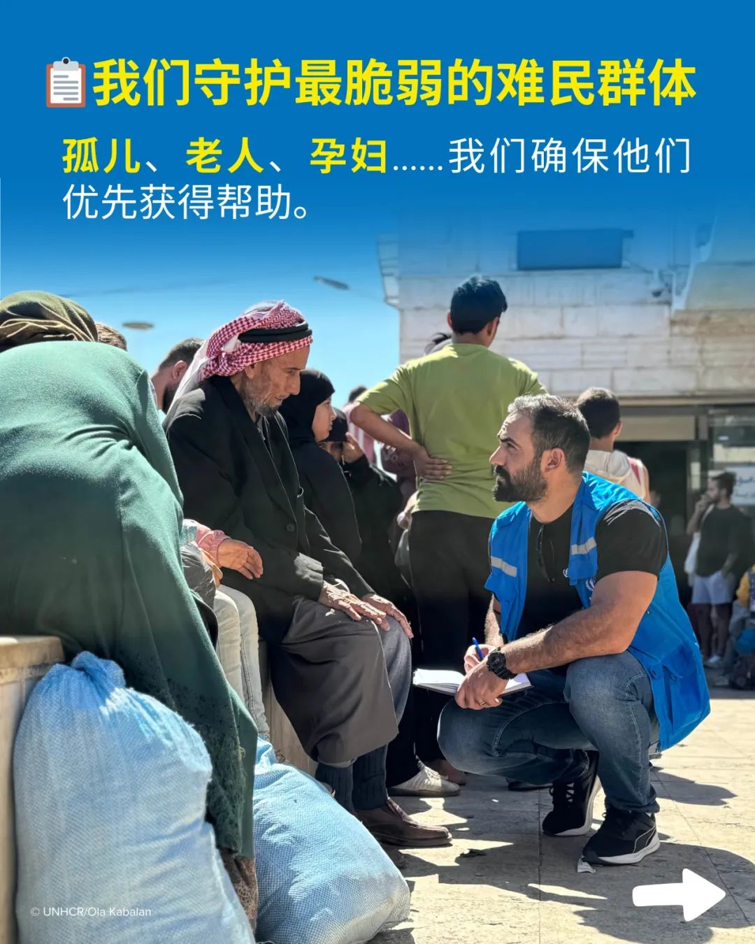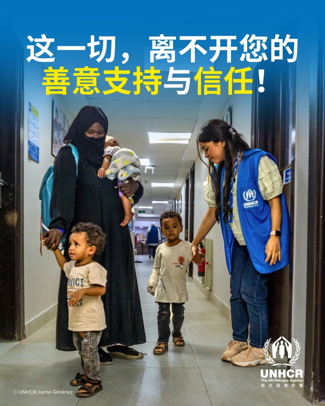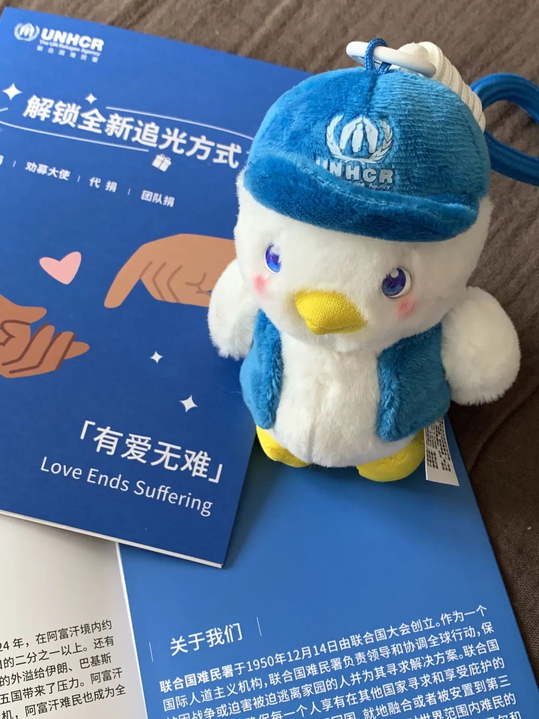 瞧,它也穿着联合国难民署标志性的蓝色马甲,头戴蓝色帽子,俨然工作在一线的员工形象。