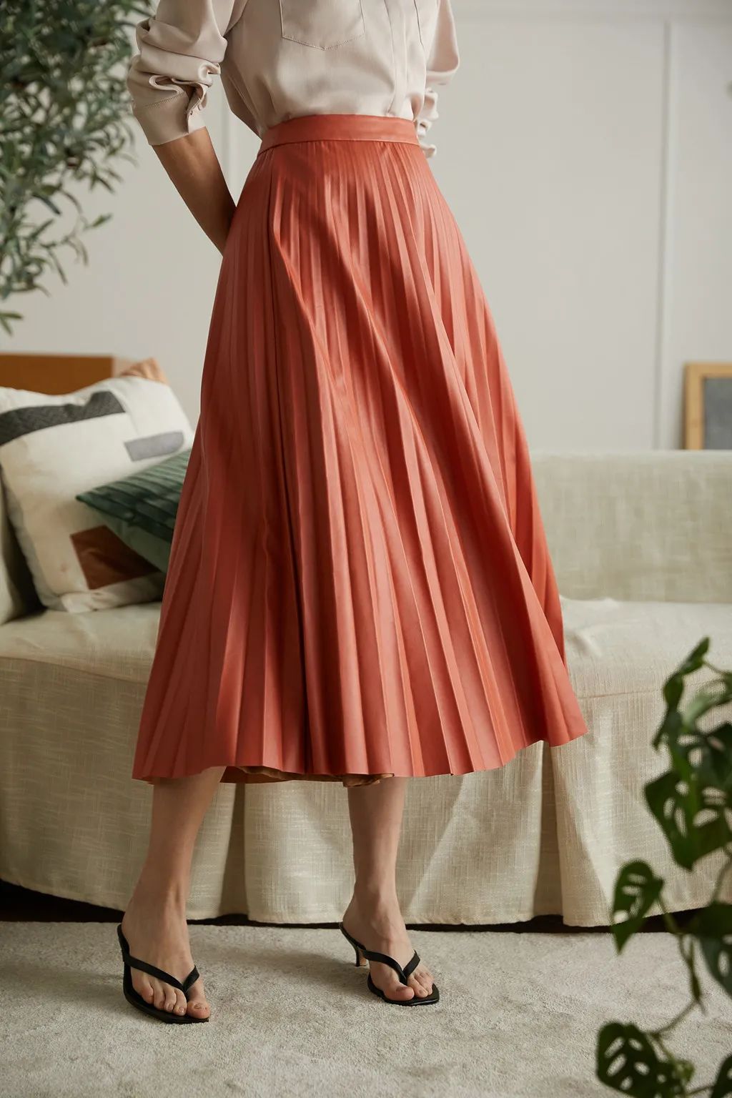 「夕烧橙仿皮百褶裙」