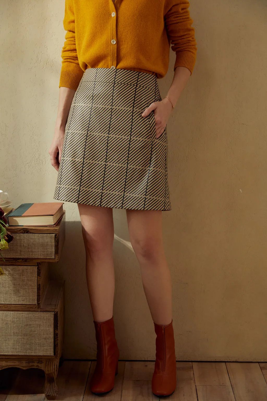 「奶咖色A字斜纹仿皮裙」