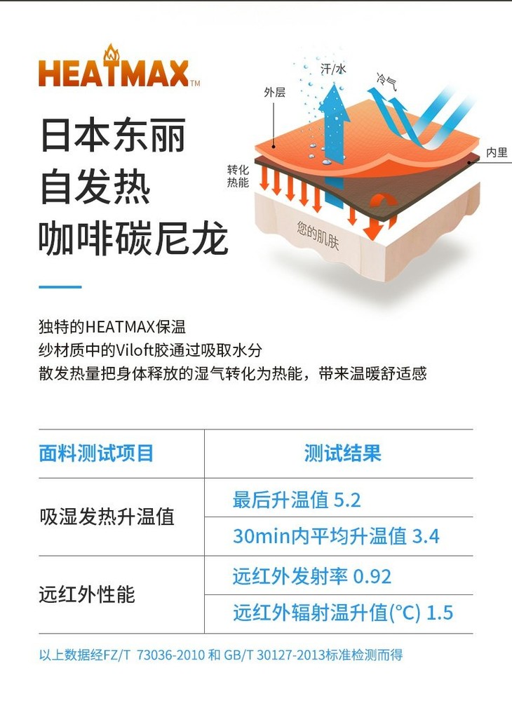 因此,目前大部分保暖内衣都利用了纤维吸湿发热的原理,利用回潮率高的纤维将汗液水分子的相变发热和动能转化为热量释放出来,提高保暖能力。