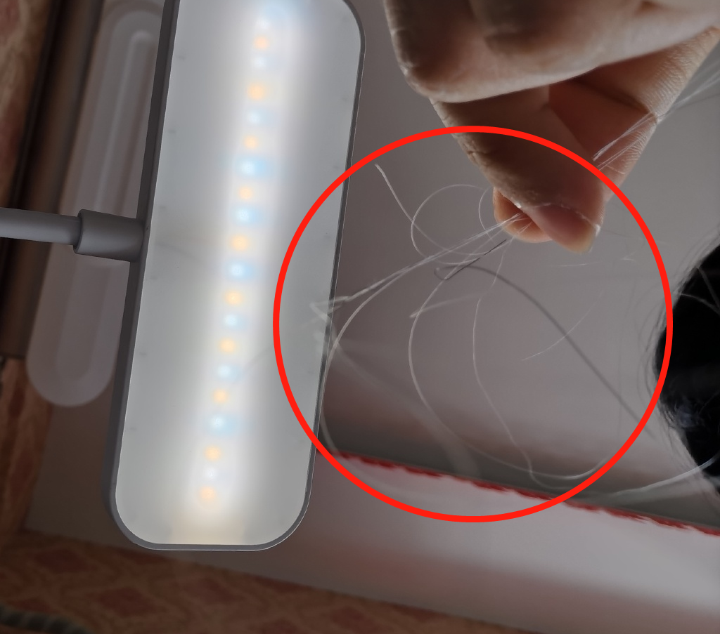 更尴尬的是:天热不能戴帽子,一低头就看到白花花的头皮,明显秃一块,还能看到几缕白发…