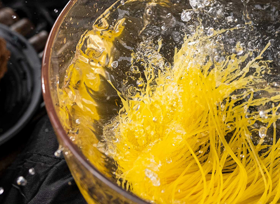 不用煮!直接烧一壶开水,给他洗一个八分钟的热水澡!再捞到盆中,用凉水稍稍过凉,盛放在大圆碗中!金黄劲道的玉米面条就可以大放光彩了!