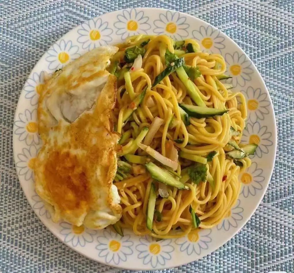 把事先调制好的料汁,浇在玉米面条上!再搭配一些时蔬小菜,轻轻一搅拌!小味道蹭得就上来了。