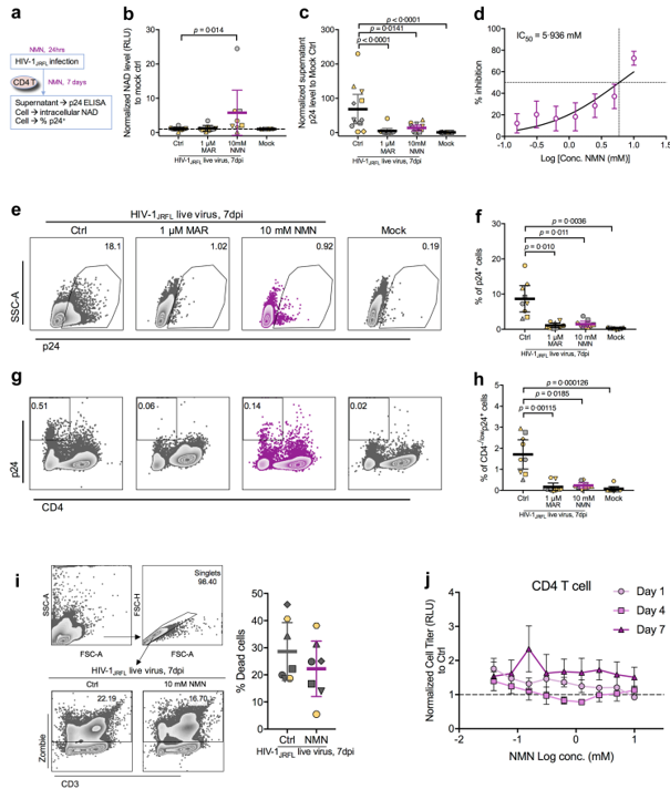 首先,研究人员在NMN处理的原代CD4+T细胞上进行了体外活HIV-1JRFL感染实验(下图a)。结果发现NMN抑制了病毒复制,IC50值为5.936mM(下图c和d)。在HIV-1JRFL感染后的第7天,NMN处理也显著降低了原代CD4+T细胞中的细胞内p24(下图e和f),并且有效感染的细胞(通常为CD4−/低p24+细胞)的百分比也降低(下图g和h)。NMN处理在实验期间没有引起显著的细胞死亡(下图i),这表明p24产生的减少不是由于NMN的细胞毒性。另外,通过评估ATP依赖性细胞活力,体外1天、4天或7天NMN处理对原代CD4+T细胞没有显示出细胞毒性(下图j)。