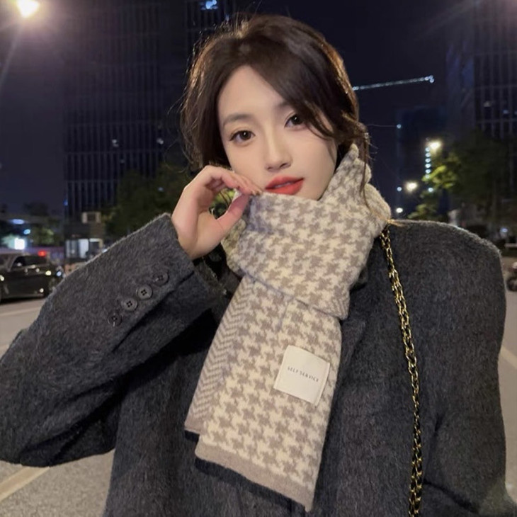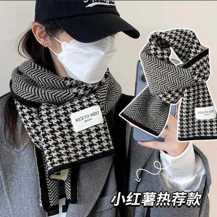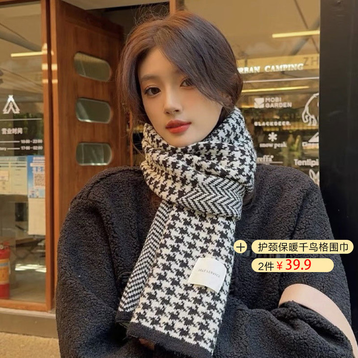 文案:39.9💰2条❗格子围巾和秋冬的适配度拉满💯针织面料一点也不扎肤,千鸟格图案复古又韩系,随便一搭就很有氛围感~