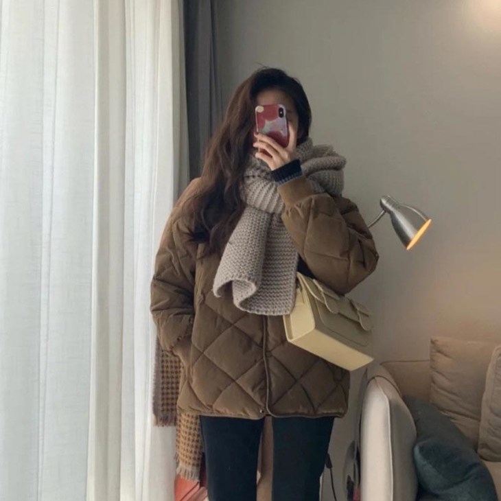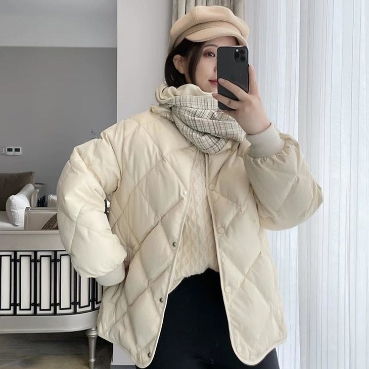 文案:冬天穿不腻的羽绒服 !无领+菱格设计,随性时髦又不显臃肿,温温柔柔百搭耐看,通勤不费力穿搭get💪
